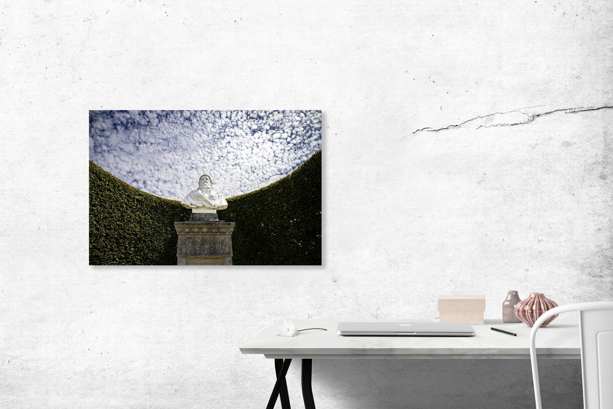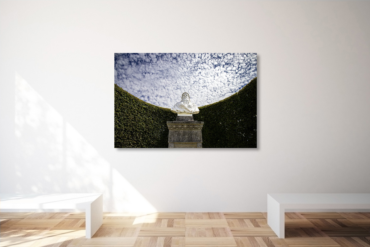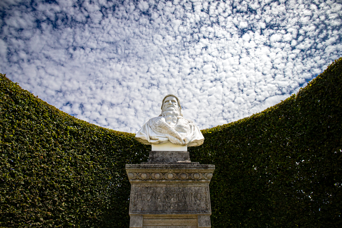 Au cœur des jardins du château d’Amboise, la statue de Léonard de Vinci veille, immuable. Cernée par une sphère de buis parfaite, elle semble flotter entre terre et ciel, comme portée par les nuages qui dessinent derrière elle un monde en mouvement.